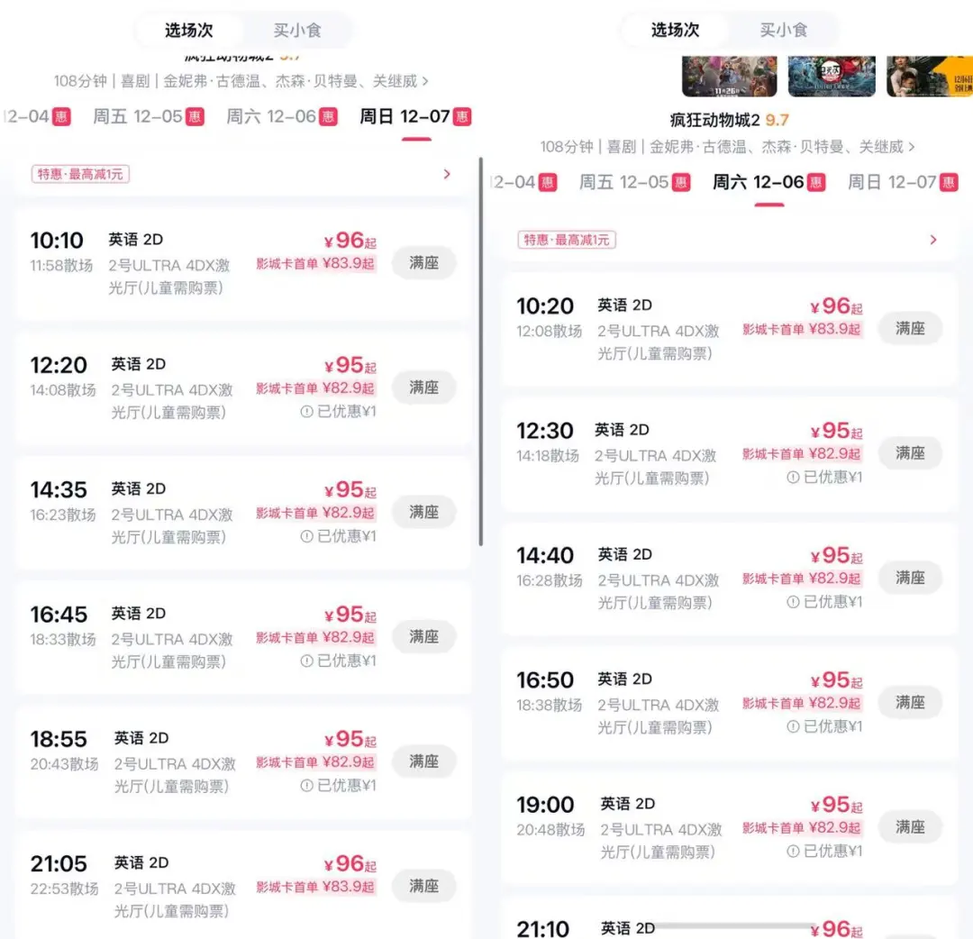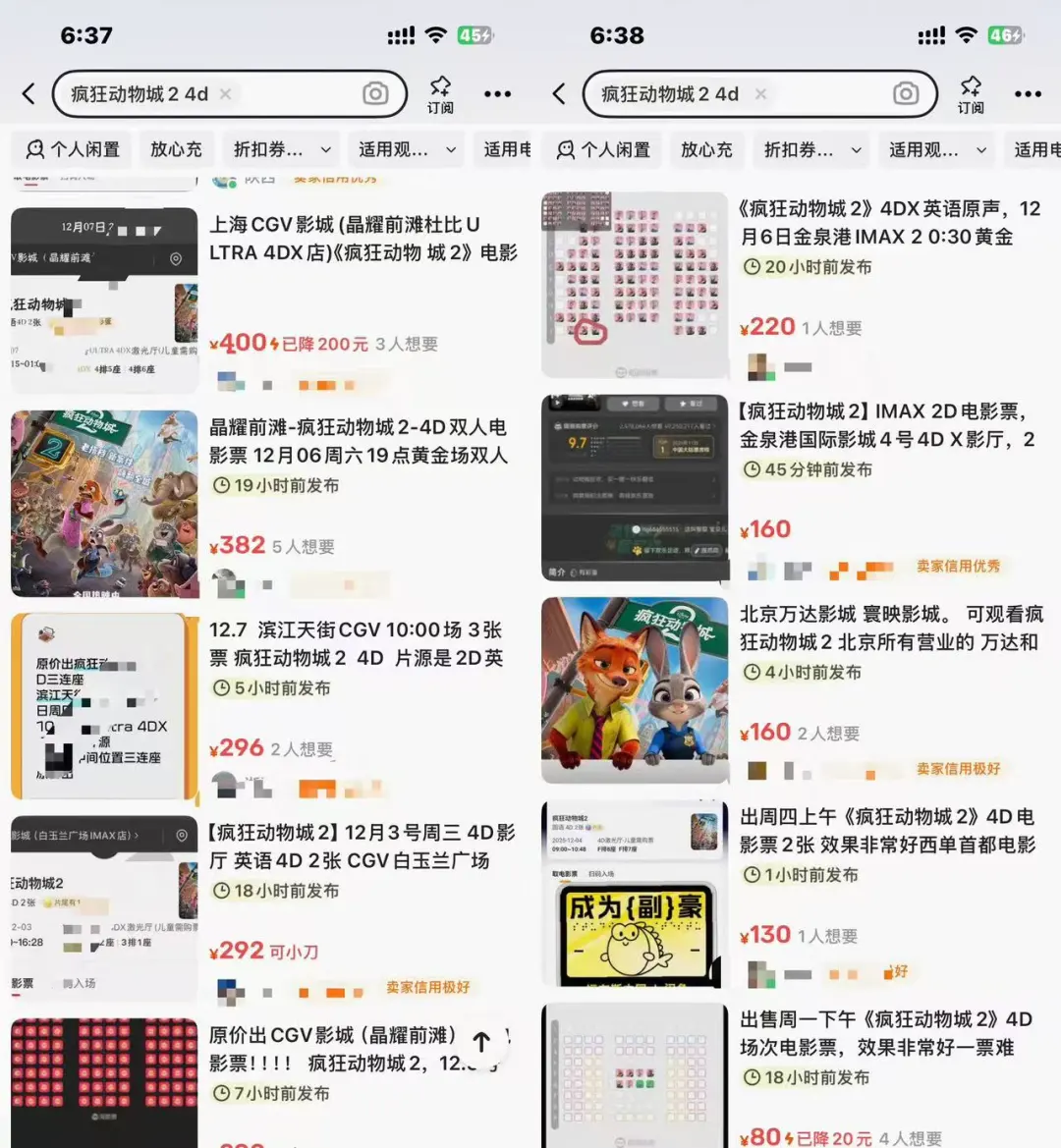 一位影院工作人员告诉记者,现在4D场次基本上开票后没多久就会售罄,连边角座位都有人买,与此同时,由于这两天4D场次咨询的观众实在太多,影院甚至提前开放了周末的4D售票链接。在社交平台的帖子中,甚至有影迷在“重金求票”。记者查询发现4D版《疯狂动物城2》的票价为40元至160不等。
