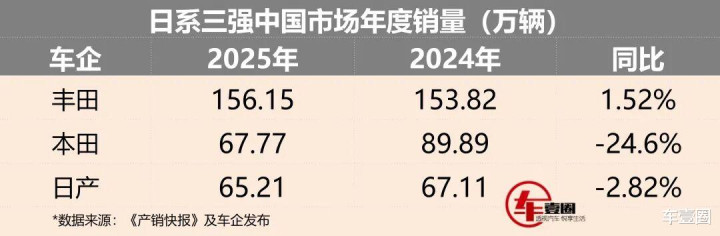 《车壹圈》观点:一番盘点后可知,即使是贵为全球车市王者、在中国市场亦拥有深厚底蕴的丰田,2025年一番忙碌后也仅有微增。再看勉强守住三强次席之本田,何时才能让人看到积极信号?至于似已找到“销量密码”的日产,则会在2026年继续向前者发起挑战。