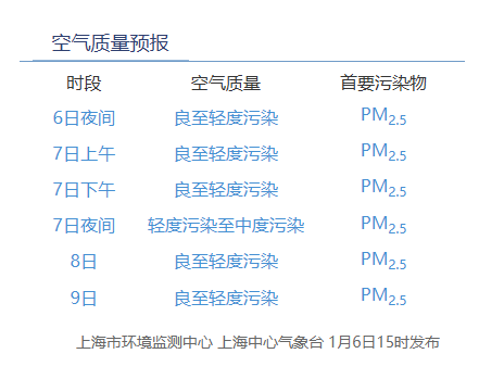 据上海环境,1月6日14时上海市实时空气质量指数为192,中度污染,首要污染物为PM₂.₅,儿童、老年人及心脏病、呼吸系统疾病患者避免长时间、高强度的户外锻炼,一般人群适量减少户外运动。